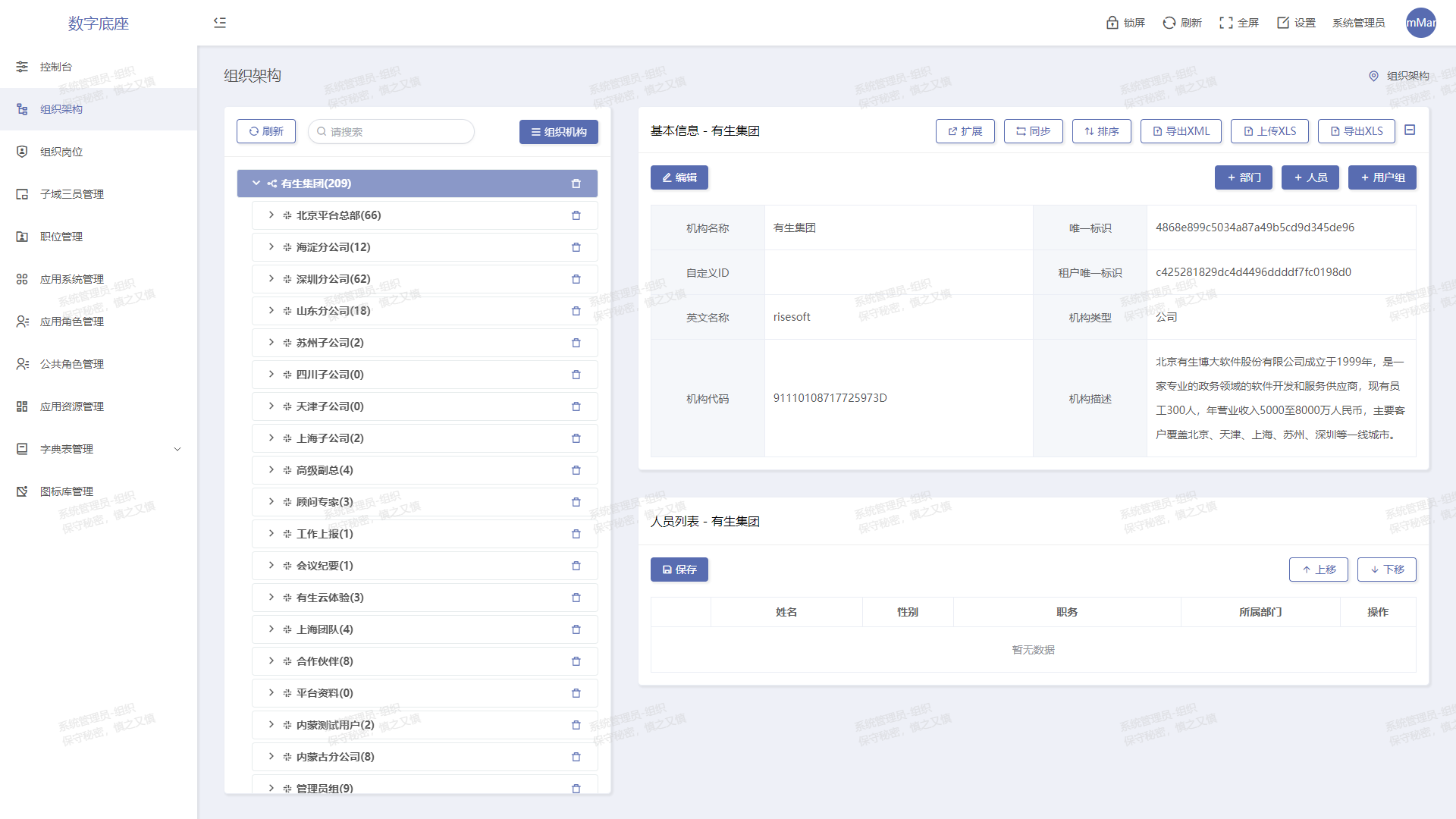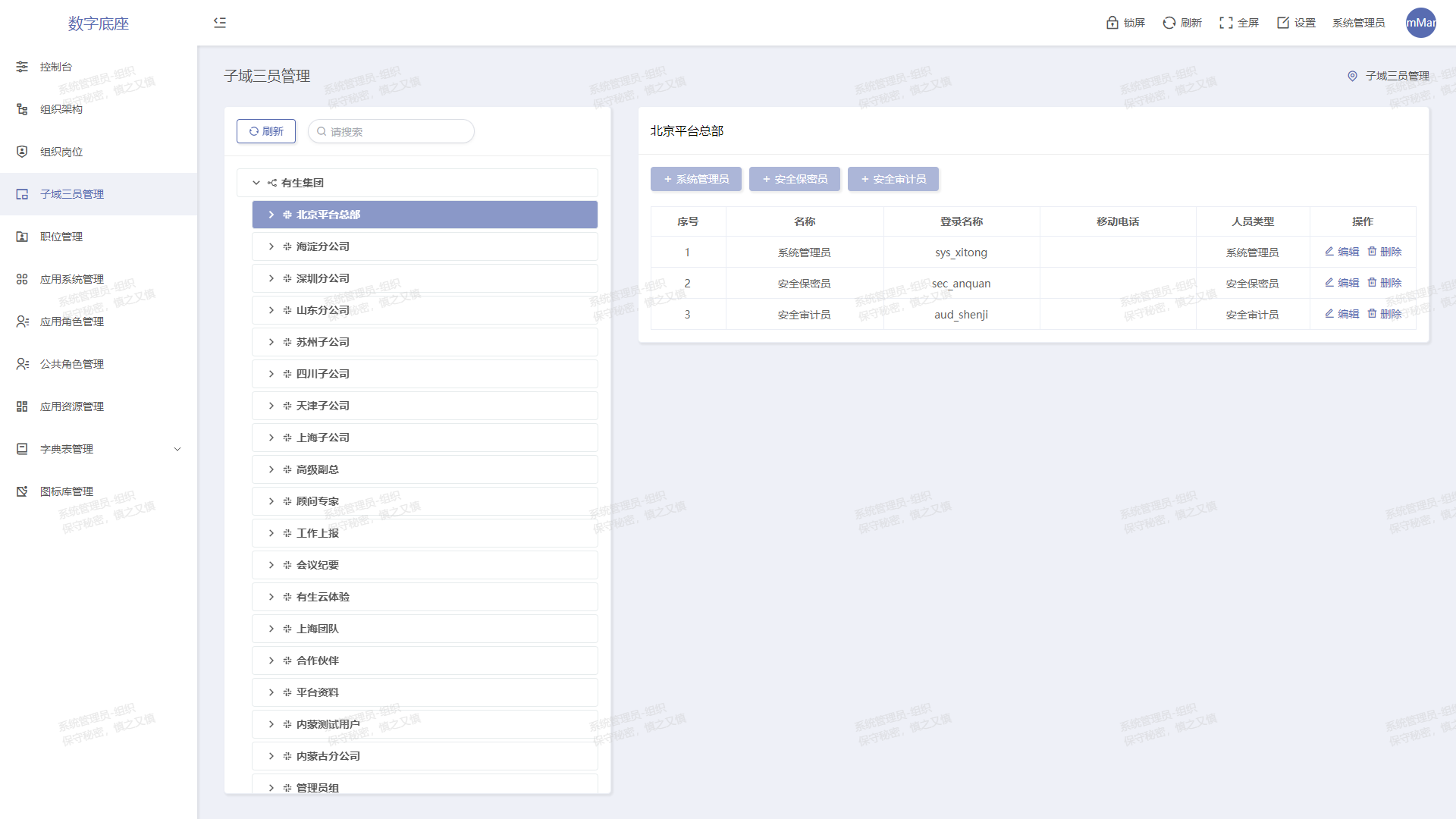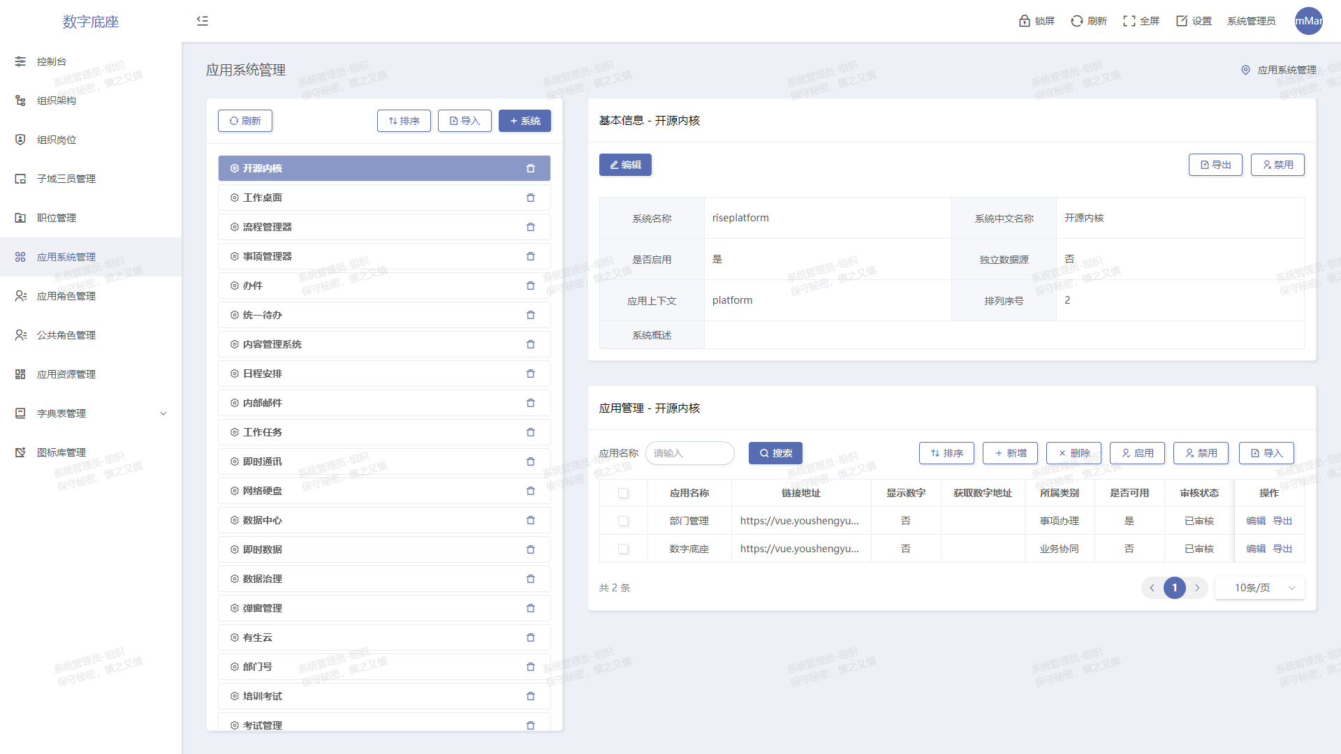 以組織結構和應用授權為主線,內置三員管理、崗位制等功能